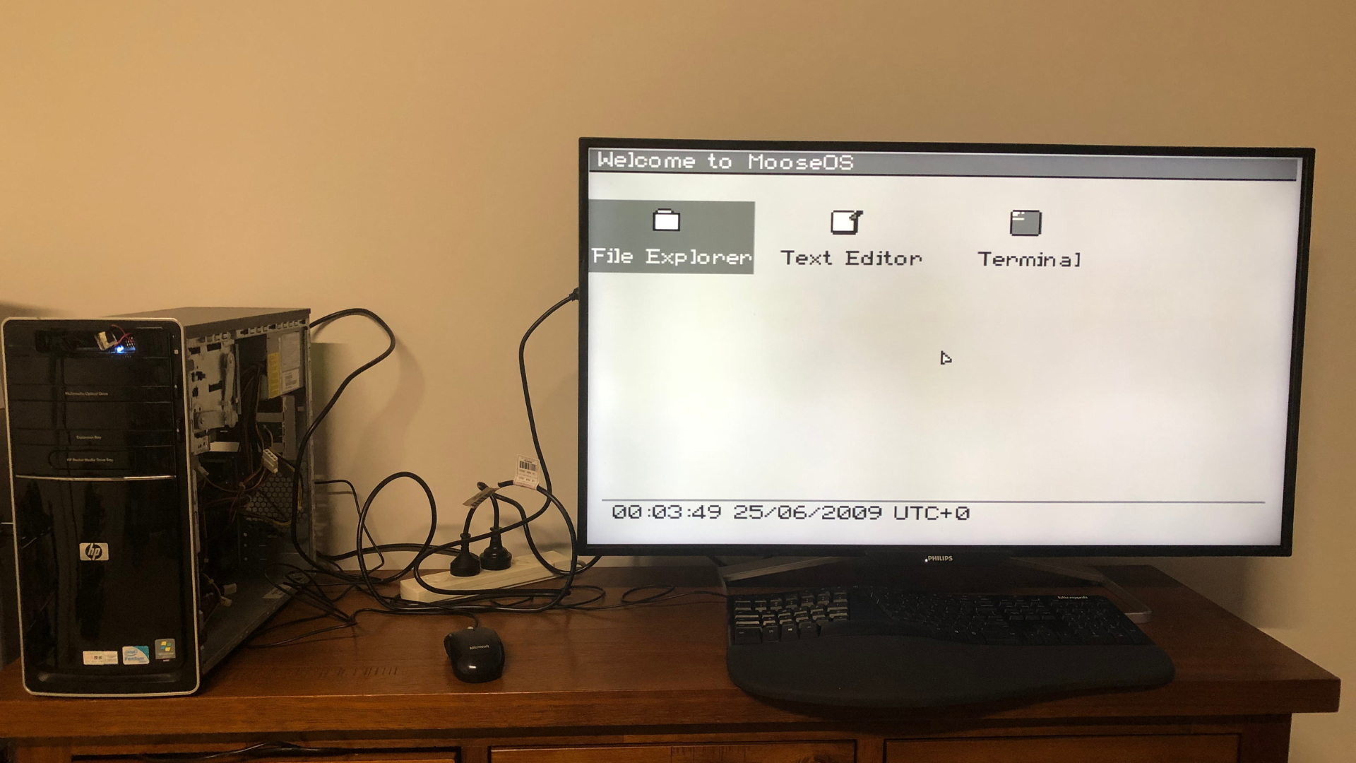 32-bit, 80s-style operating system written in C, designed to run on QEMU, Bochs, or real hardware. It features a VGA 320x200 256-color graphics mode, a dock-based desktop interface, and full PS/2 keyboard and mouse support. The OS includes a complete IDT with 32 exception handlers, and built-in applications such as a terminal emulator, text editor, and file explorer. MooseOS also implements an audio system for tone generation, ATA disk read/write operations, and a real-time clock. It was featured on the front page of Hackaday.com.